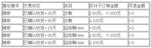另據賣家網記者了解,根據三包法的規定結合淘寶規則,還將從女鞋、運動鞋類目試點,將售后維修的申請入口開放的時間規則根據不同的場景開放。