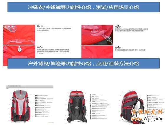 針對一些有特殊功能特性或使用場所的商品,進行場景說明,如沖鋒衣的防水性展示、運動器械對室內(nèi)或戶外場地要求等。
