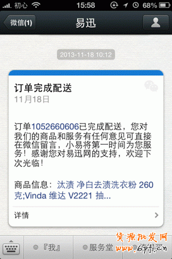 在傳統(tǒng)的 PC 互聯(lián)網時代,當用戶完成整個購買過程后,會不斷地登錄網站,察看這個商品的流程到達哪個階段了。現(xiàn)在,所有的通知流程都會在微信公眾帳號內完成。比如購買完微信會通知你“已經購買成功”,過一段時間微信會通知你“打包了,馬上要出貨了”,還會告訴你“明天會送過來“,明天大概什么時候送過來,是哪個人送過來,名字和聯(lián)系電話,到時候不是快遞哥打電話給用戶,而是用戶主動問快遞哥“你怎么還沒到”。
