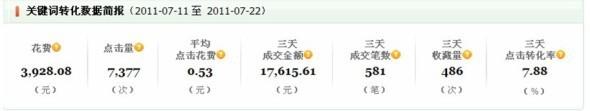 直通車是把一個沉默無語的產(chǎn)物,推成明星的性價比最好的方法,我們首要剖析一些次搶手詞匯,然后放在恰當(dāng)?shù)漠a(chǎn)物下面,經(jīng)過設(shè)置多個長尾詞匯,漸漸把要推的爆款預(yù)熱,再共同店內(nèi)運動。我們的均勻點擊單價只要0.52元,大大低于同業(yè)的評價程度,并且直通車的轉(zhuǎn)化率高于全店的均勻值