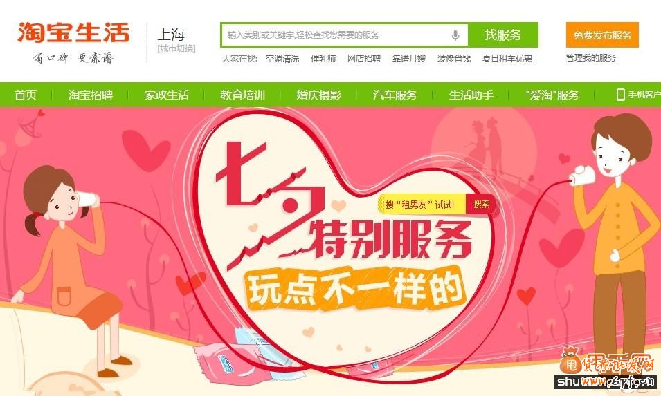 主題特別:七夕特別服務,就是玩點不一樣的服務。這是“淘寶生活”頻道的主題廣告,他過去搜索下 “租一個男朋友試試”傳達的是 在這里可以找到你想要的東西,而這些都是當下流行的詞語。