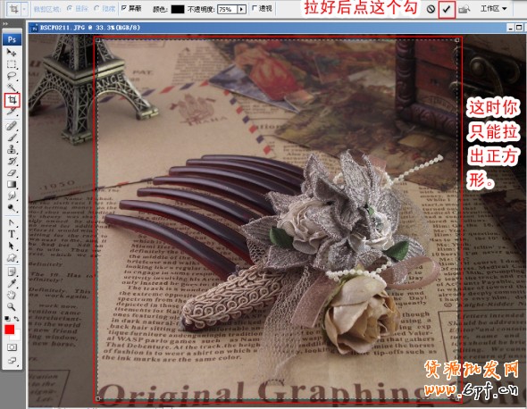 然后用裁剪工具拉,這時你只會拉出正方形的選區。因為我們設置的寬高是一樣的。