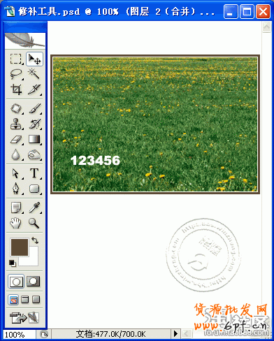 操作的方法與仿制圖章工具相似。按住Alt鍵,在無文字區(qū)域點擊相似的色彩或圖案采樣,然后在文字區(qū)域拖動鼠標復制以復蓋文字。只是修復畫筆工具與修補工具一樣,也具有自動匹配顏色的功能,可根據(jù)需要進行選用。