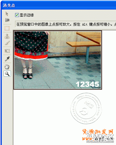 6、一些透視效果較強的畫面(如地板),可以應用“消失點”濾鏡進行處理。圖例中的操作的方法是,框選要處理的文字區(qū)域,(防止選區(qū)以外的部分也被覆蓋)執(zhí)行菜單命令:濾鏡→消失點,進入消失點濾鏡編輯界面。