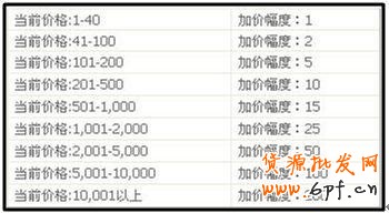 2、加價幅度:指出價的買家為了超越前一個人的出價在當前出價上允許增加的最低金額。賣家在發布寶貝的時候可以自定義加價幅度,也可以使用系統自動代理加價。系統自動代理加價的加價幅度隨著當前出價金額的增加,隨之增加。