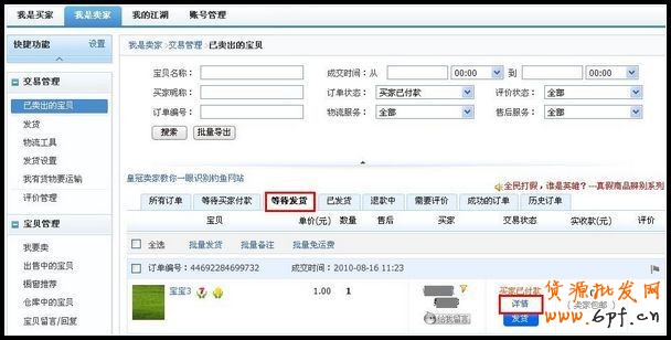 賣家登錄到“我的淘寶”—“我是賣家”—“發貨”—“等待發貨的訂單”在具體的訂單后點擊“發貨”