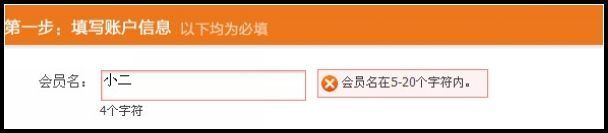 情況二:會員名的長度不符(一個漢字為2個字符,數(shù)字、英文字母、符號等占一個字符)。請控制在5-20個字符內(nèi);