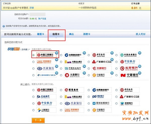 2、在【信用卡】頁(yè)面下,點(diǎn)擊“快捷支付(含卡通)”的【中國(guó)工商銀行】——【下一步】;