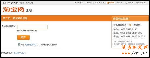 填寫手機號碼,必須是未被注冊使用的手機號。 進入該頁面,說明之前提交的注冊信息已成功,此時您已有了一個未激活的淘寶賬戶,需要輸入手機收到的校驗碼進行激活,若您不小心把該頁面關閉了,不用著急,進入登錄頁面輸入賬戶名和密碼,點擊“登錄”該頁面又會出現。