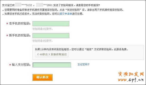 3、輸入老手機(jī)、新手機(jī)的校驗(yàn)碼還有支付密碼,點(diǎn)擊【確認(rèn)提交】;