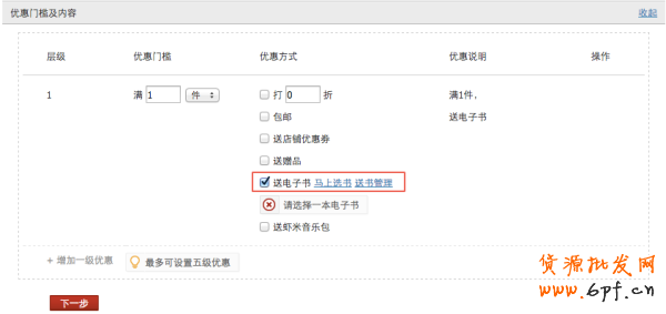 在設置店鋪活動的時候,勾選“送電子書”,如下圖所示,如果你是第一次使用該功能,則需要你先免費簽約開通:
