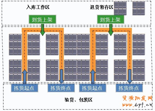 僅需經過一次,同時直接在揀貨時完成分揀,如上圖所示。完畢后,將貨源將揀貨車推到驗貨區。