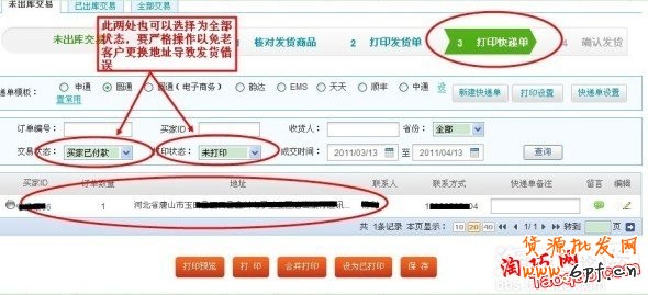 - 此處打印,顯得繁瑣,好像必須得從核對發貨商品項里找到該買家的信息之后才能進入快遞單打印項。另外備注之后還需點擊保存及保存之后的重新選定買家才能打印。