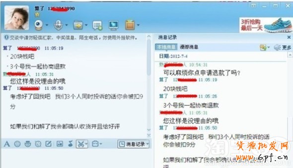 4、不要使用除阿里旺旺外的聊天工具,避免不良買家敲詐勒索無法舉證。