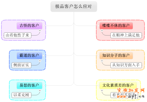 處理方法:針對這樣的顧客,要“以柔克剛”, 就像茶葉,多沖幾壺水,顏色就變淡了。要多溝通,讓客戶知道自己的錯,或是我們因什么原因造成的問題等等,妥善的解決,這類的客戶最容易成為忠實的口碑傳播者,所以,我們不要吝嗇自己溫暖的語言和道歉。