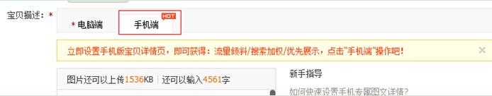 手機內頁詳情裝修:在PC端后臺請看手機端,注意紅色字體,設置手機版寶貝詳情。