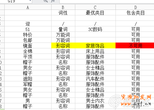 我們看A類:是標題拆分后的一個結果,B類是詞性,C類是最優(yōu)類目,D類是該寶貝的最優(yōu)類目的包含情況,以上數據采集來自數據魔方。