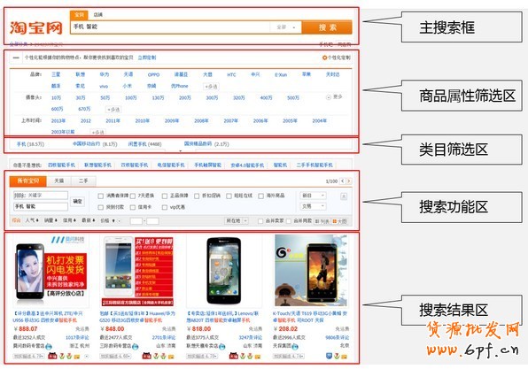 自淘寶網有了按類目、按屬性發布的商品后,就有了商品索引基礎,算法引擎就可以根據商品關鍵詞,為買家提供精確的搜索結果。那么,淘寶搜索的頁面結構是怎樣的呢?小編馬上跟大家一起來了解一下: