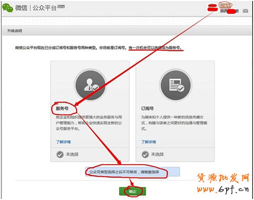 3、進入升級服務號的頁面后,只要選擇“服務號”,并點擊確認就可以成功升級了。但是必須要注意,這兩種號只能選擇一次,確定選擇之后就不能再做修改了,所以一定要謹慎考慮,哪一種最適合自己。