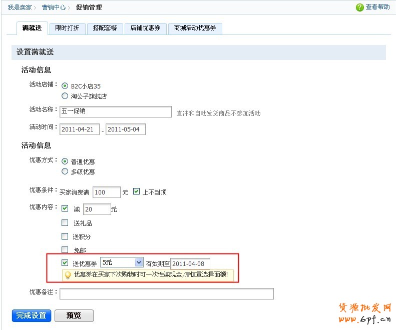 如果您有開通官方網店,那么會在活動店鋪選擇中看到兩個店鋪,一個為淘寶商城店鋪,一個為官方網店。兩者在設置上的唯一區別是,若選擇官方網店,則“優惠內容”中不會出現“送積分”選項,積分是商城獨有的。活動設置一旦完成,不能對活動店鋪進行修改。