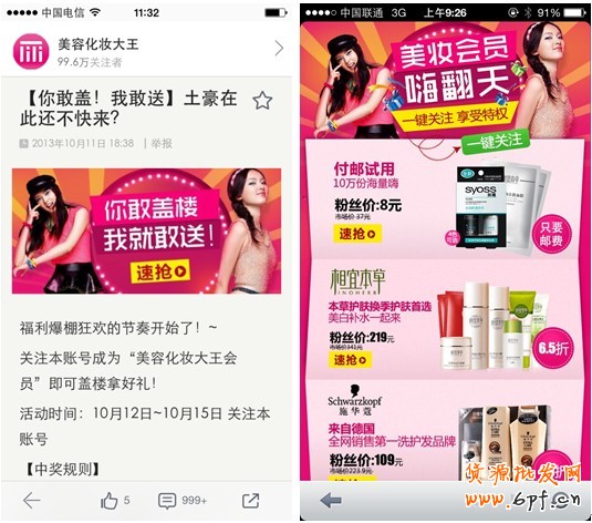 作為天貓最大的化妝品渠道商,麗人麗妝旗下聚集了相宜本草、美寶蓮、施華蔻、蘭芝、H2O等數(shù)十個知名美妝護膚品牌。為了“聚合”這些品牌的力量, 麗人麗妝開通了一個微淘賬號“美容化妝大王”。2013年10月12日至16日,該賬號聯(lián)合18家旗下品牌旗艦店,發(fā)起“一鍵關注 享受特權”的美妝會員嗨翻天活動,并齊集10萬份護膚套裝進行付郵試用的海派,令粉絲們體驗并分享福利。在短短的5天內帶來60萬的粉絲會員與187萬的成交總額。活動后,18個店鋪的手機成交量平均漲幅達到4.7倍,平均轉化達到23%,是除雙十一之外的最好數(shù)據。