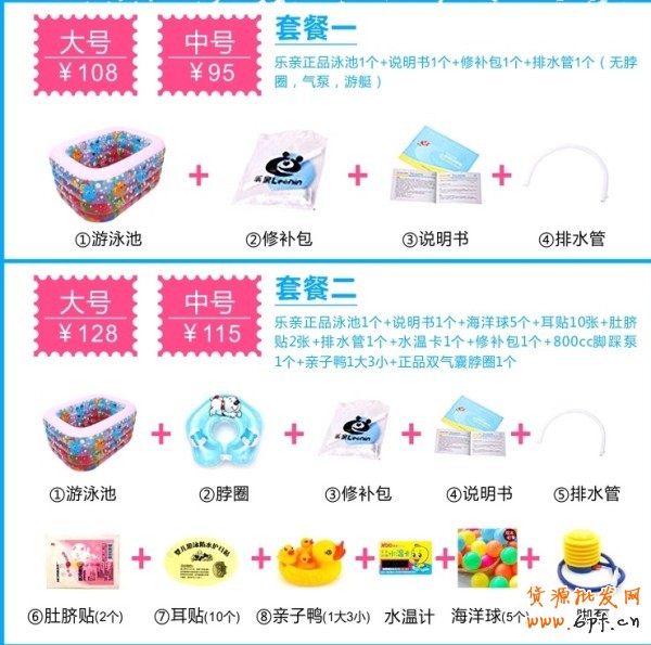 下圖中的電動充氣泵和腳踩充氣泵之間產生了一個很強的對比效應,而水池的體積決定了買家使用打氣泵較為方便,這就使得一個功能性的關聯搭配產生了強烈的引導性,導致很多買家買了帶電動打氣泵的套餐。