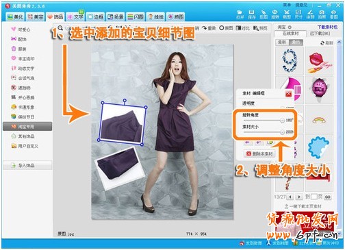 第二步:對添加進來的細節圖,需要根據自己的實際情況,適當調整大小、角度和位置,甚至透明度。只要選中需要編輯的寶貝,就可以自由設計了。