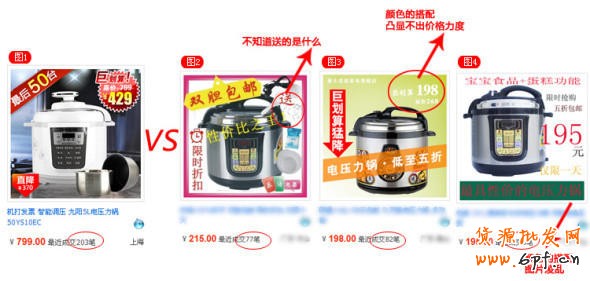 在同類寶貝中,你想推哪個(gè)產(chǎn)品,再去更好的優(yōu)化它,優(yōu)化其內(nèi)容本身是很重要的,但其主圖更是首要,因?yàn)槊總€(gè)顧客進(jìn)入你的店鋪,如果所有的東西都是平淡無奇,很難引導(dǎo)顧客到底去點(diǎn)哪個(gè)好,很難讓他知道,哪個(gè)才是最近做促銷的商品,同上圖所示,在一個(gè)頁面的壓力煲中,紅圈中的50YS10EC,馬上進(jìn)入了顧客眼簾。主圖的促銷元素,馬上知道了寶貝的力度和時(shí)間的緊迫。