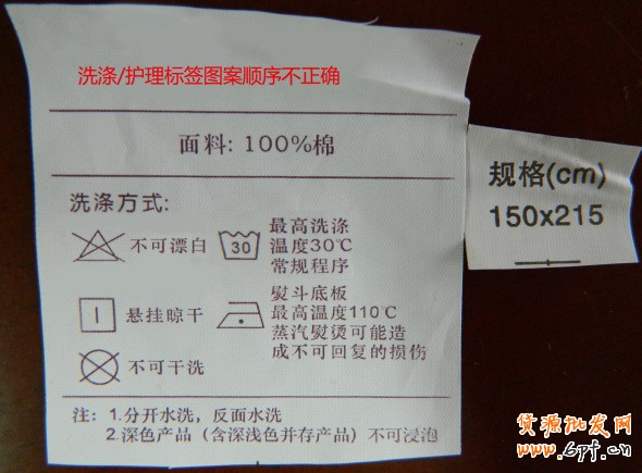 吊牌和耐久性標(biāo)簽上的洗滌/護(hù)理標(biāo)簽5個圖案必須按照“水洗——漂白——干燥——熨燙——專業(yè)紡織品維護(hù)”的順序排列。