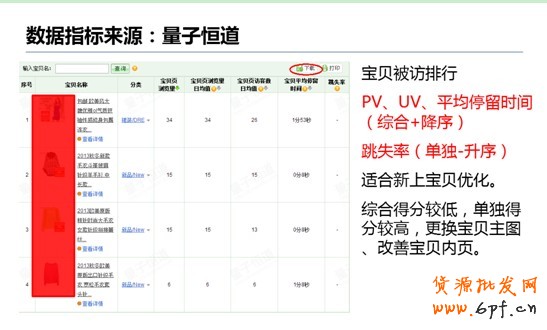 在量子恒道中,有一項“寶貝被訪排行”的功能,我們可以在這里獲取我們需要的數據。對于剛上架不久且零銷量的寶貝,建議選取的數據維度:PV、UV、平均停留時間,這些數據維度都是“往上走”的,帶有降序性質;最后還要單獨分析寶貝的跳失率。如果某款寶貝的總分值較低,而跳失率得分較高,說明這款寶貝的內頁需要進行重點優化。