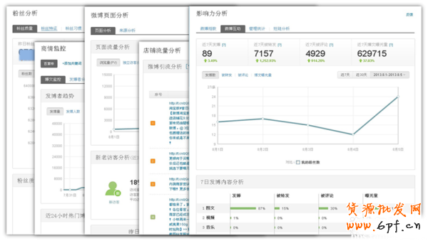 后臺除了擁有大家熟知的微博功能外,可以看到還專門增加了一個數據中心,包含了粉絲分析、商情監控、微博頁面分析、店鋪流量分析和影響力分析。這些數據工具不僅能夠全面展現微博運營的狀況,更可以展示導流數據。