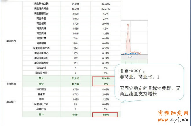 我分析過大丶中丶小淘寶店鋪,一般比較合理的流量比例是:自然流量35-50%丶直接點擊流量 15-20%丶直通車流量35-40%丶淘寶客5-10%,其它少到乎略不計;這里沒有包含鉆展丶硬廣丶活動流量,因為這些使用的不多,也沒有固定的頻 率,暫不統計(大賣家會占到一定的比例)。目前比較靠譜的流量來源有活動流量丶搜索流量丶直接點擊流量丶硬廣或鉆展流量丶直通車流量丶淘寶客流量。