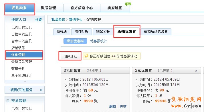 1、進入后臺 ——> 我是賣家 ——>促銷管理——>點擊“店鋪優惠券”——>點擊“創建活動”——>根據店鋪的需要,選填相應的內容 ——>點擊“確認”