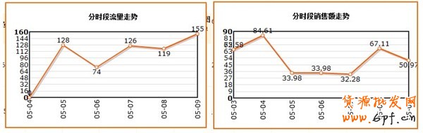 這兩張圖分別是在打底褲類目下轉化率排在前五位的寶貝的流量圖和銷量圖