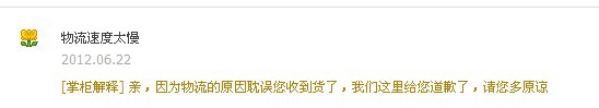 作為賣家,看到這樣的評價是否會郁悶得吐血呢!我們又不是自有物流,因?yàn)槲锪髟蜻€要怪罪于店家,可不冤枉!但看到店家的解釋,是不是讓人有如沐春風(fēng)的感覺呢?謙卑有禮,讓人頓生好感。雖然是個中評,但是絲毫不會影響到人的購買欲望,反而讓人對店家心生敬佩呢。