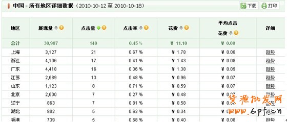 另外,我們還可以看到量子統(tǒng)計中的地域報表-中國-所有地區(qū)詳細(xì)數(shù)據(jù)。找出平均點擊花費低,但是點擊率卻比較高的地區(qū),這些地區(qū)可以稍微加大投放力度。