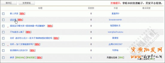 可以看到跳出管理頁面,非常清晰的列出了所有的帖子,點擊左側的每個標題就可以對應打開查看留言詳情了。非常簡單明了吧,當然上面還有“發(fā)表新帖”“精華區(qū)”兩個按鈕。掌柜也可以自己發(fā)表帖子,作為一些公告公示;