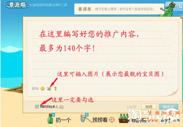 目前更新后的飄流瓶版本,對我們做廣告有了更好的幫助!第一,就是它可以插入圖片了,,雖然圖片小了點,可是它可以放上我們的主打寶貝,放上適合別人需要的寶貝圖!第二,就是它現在可以把我們同樣的內容扔給多個人,這樣就不止一個人會收到我們的瓶子!