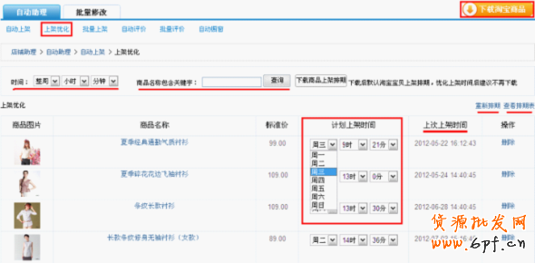 5.進入“重新排期”,便可批量處理寶貝,設置寶貝的上下架時間。注意:盡力保證在重要時間段都能有寶貝上線。