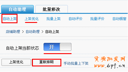 4.如果掌柜對自己的上架計劃不滿意,想重新進行設置,可點擊“重新排期”(上圖),或者通過點擊“自動助理”欄的自動上架→重新排期 進入(下圖)。這個功能能幫助掌柜重新設置寶貝上架時間。
