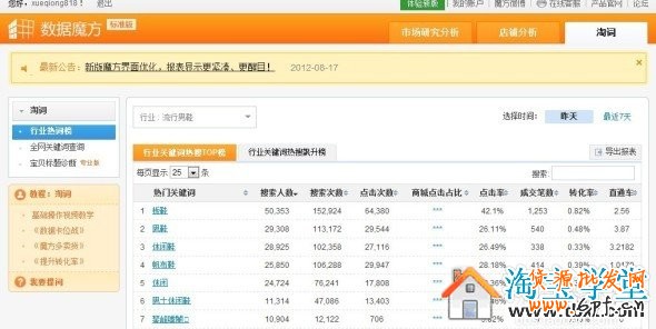 內容相當詳細,包括了: 關鍵詞 搜索次數 占比 點擊次數 商城點擊占比 搜索人數 點擊率 當前寶貝數 轉化率 直通車的平均出價。接下來,我們就可以從這里一個個尋找篩選我們需要的關鍵詞和長尾詞了。讓我們仔細看看我找的這個 “男休閑鞋2012新款”長尾詞。