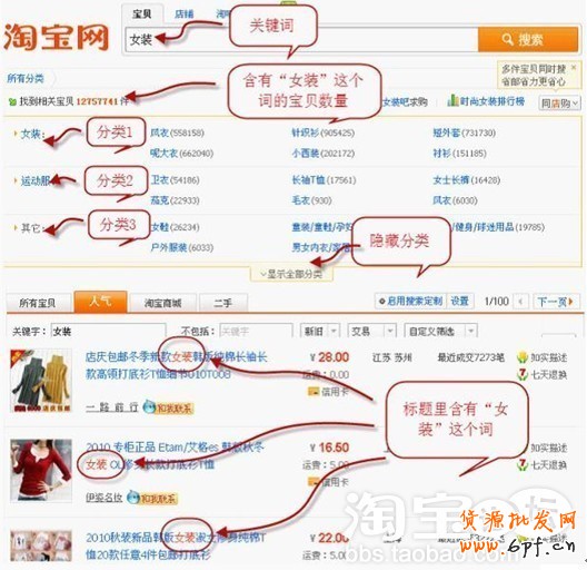 第二層就是類目相關性,就是說,在某個關鍵詞展示的寶貝里,有部分寶貝排名靠前了,而這些寶貝,恰好是與關鍵詞相關的分類下的寶貝