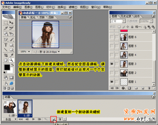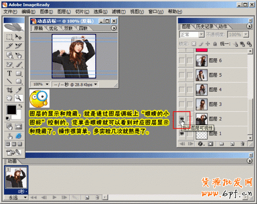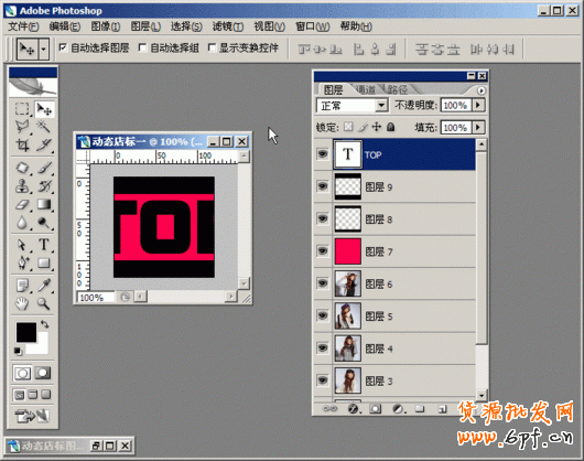 4.F7調(diào)出圖層調(diào)板,我們得到了一個多張照片重疊在以前的多圖層文件。PS:設(shè)計制作動態(tài)網(wǎng)店店標(biāo),主要就是配合圖層使用PS捆綁的軟件ImageReady完成的。因此圖層調(diào)板的使用就是核心技巧。