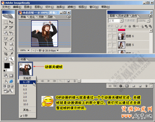 14.GIF動畫的核心就是通過一個個動畫關(guān)鍵幀完成,關(guān)鍵幀就是動畫調(diào)板上的那個小窗口,我們可以通過點擊調(diào)整這幀的演示時間。