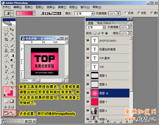 11.使用漸變工具徑向模式,注意拾色器調(diào)整出粉紅色前景色和桃紅色背景色,制作出發(fā)光效果的圖層10,所有準(zhǔn)備工作做好了點擊切換到ImageReady。