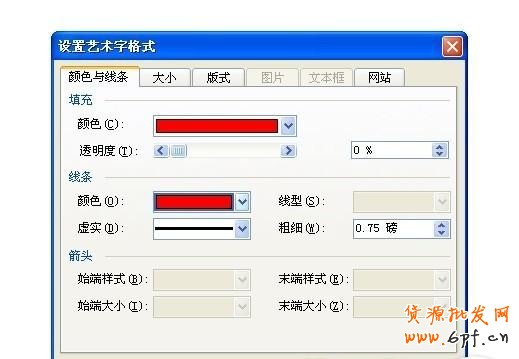 鼠標右鍵單擊文字,出現藝術字格式面板,把填充和線條都設為紅色,確定,如下圖