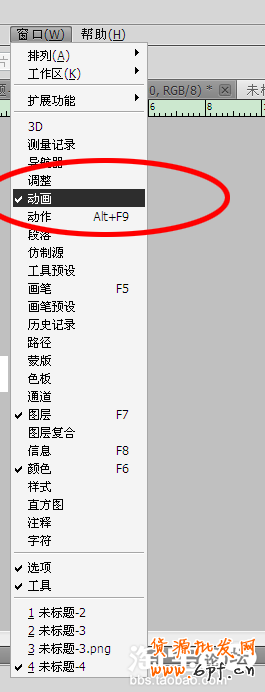 好了,下面我們就來看下具體的步驟吧,這里我們要用到imageready,一般新版的PS都是自帶這個功能的,不需要另外下載這個軟件了。我們先在PS中調(diào)出imageready這個功能,這個功能在哪里呢?我們只要點(diǎn)擊菜單欄中的窗口→動畫即可,使動畫在勾選狀態(tài)。