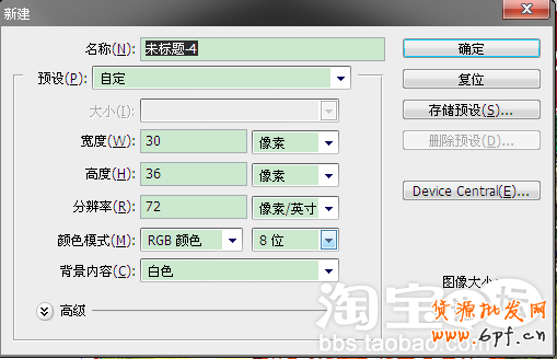 OK,打開窗口之后,我們就要開始制作秒鐘倒計時了,我們先要新建一個背景圖層,具體要建多大呢,剛剛我們上面講了,在切片的時候當(dāng)切時分秒這幾個數(shù)字的時候我們用了固定的大小進(jìn)行切片,是30*36的大小,所以我們現(xiàn)在只要新建這么大小的背景層就可以了,至于背景圖層的顏色,我們直接選擇白色就可以了,因?yàn)槲覀兊哪0灞尘笆前咨模?dāng)然也可以選擇其他顏色,視具體情況而定。