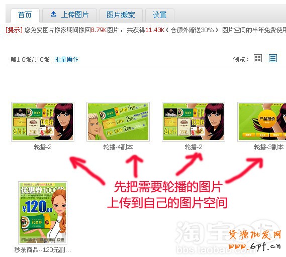 1. 先把想要的圖片上傳到圖片空間里,個人覺得3-5張為宜。不要弄少了,也不要弄多。