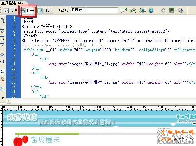 2、用Dreamweaver8.0打開“促銷區(qū).html”文件。并切換到“拆分”模式。在此模式下,上半部分為代碼區(qū),下半部分為設(shè)計(jì)區(qū)。